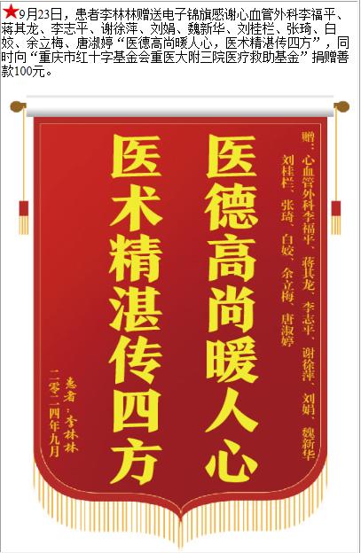 患者李林林赠送电子锦旗感谢心血管外科李福平等人,并向医疗救助基金捐赠善款100元。-锦旗-患者心声-患者服务-重庆医科大学附属第三医院【官方网站】