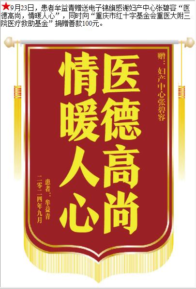 患者牟益青赠送电子锦旗感谢妇产中心张碧容,并向医疗救助基金捐赠善款100元。-锦旗-患者心声-患者服务-重庆医科大学附属第三医院【官方网站】