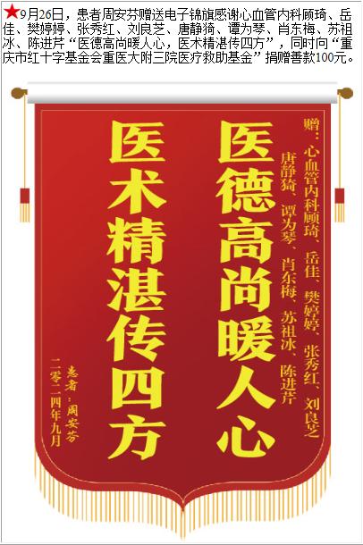 患者周安芬赠送电子锦旗感谢心血管内科顾琦等人,并向医疗救助基金捐赠善款100元。-锦旗-患者心声-患者服务-重庆医科大学附属第三医院【官方网站】