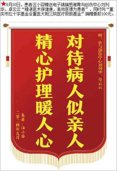 患者汪小容赠送电子锦旗感谢骨与创伤中心刘列华等人,并向医疗救助基金捐赠善款100元。-锦旗-患者心声-患者服务-重庆医科大学附属第三医院【官方网站】