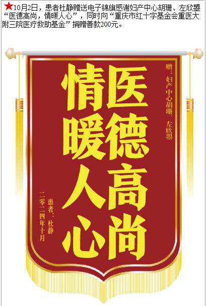 患者杜静赠送电子锦旗感谢妇产中心胡珊等人,并向医疗救助基金捐赠善款200元。-锦旗-患者心声-患者服务-重庆医科大学附属第三医院【官方网站】