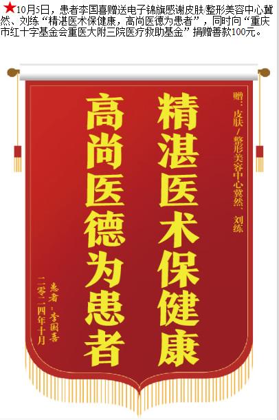 患者李国喜赠送电子锦旗感谢皮肤/整形美容中心冀然等人,并向医疗救助基金捐赠善款100元。-锦旗-患者心声-患者服务-重庆医科大学附属第三医院【官方网站】