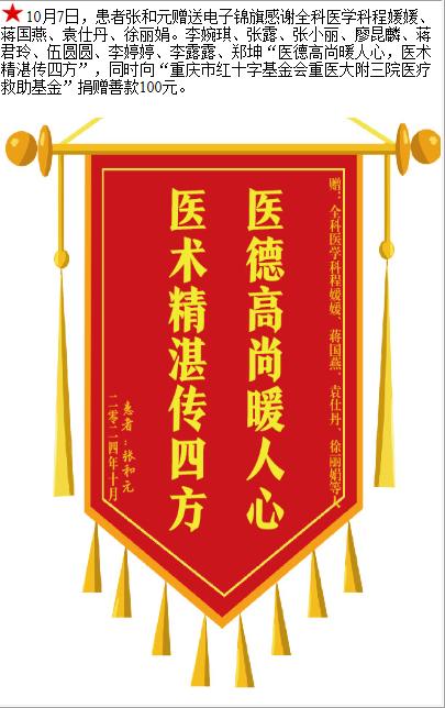 患者张和元赠送电子锦旗感谢全科医学科程媛媛等人,并向医疗救助基金捐赠善款100元。-锦旗-患者心声-患者服务-重庆医科大学附属第三医院【官方网站】