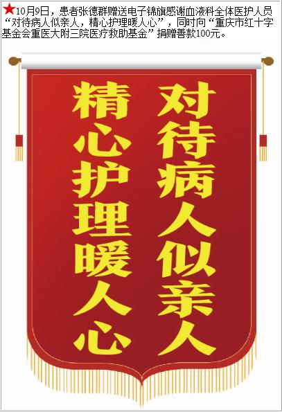 患者张德群赠送电子锦旗感谢血液科全体医护人员,并向医疗救助基金捐赠善款100元。-锦旗-患者心声-患者服务-重庆医科大学附属第三医院【官方网站】