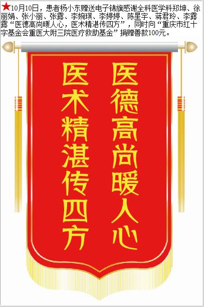 患者杨小东赠送电子锦旗感谢全科医学科郑坤等人,并向医疗救助基金捐赠善款100元。-锦旗-患者心声-患者服务-重庆医科大学附属第三医院【官方网站】