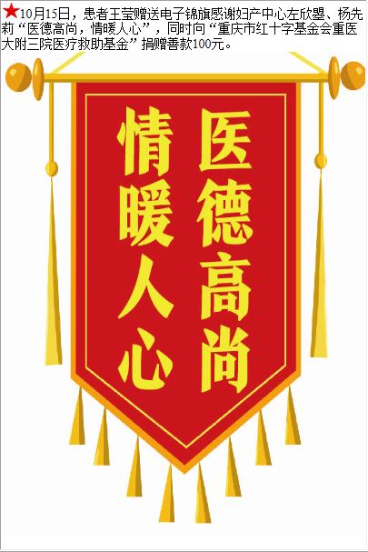 患者王莹赠送电子锦旗感谢妇产中心左欣曌等人,并向医疗救助基金捐赠善款100元。-锦旗-患者心声-患者服务-重庆医科大学附属第三医院【官方网站】