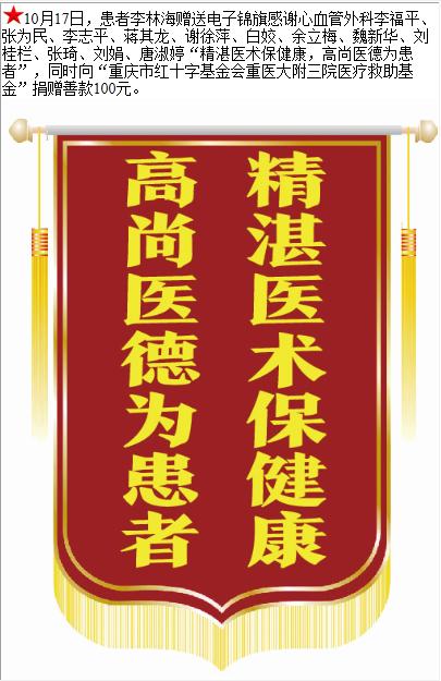 患者李林海赠送电子锦旗感谢心血管外科李福平等人,并向医疗救助基金捐赠善款100元。-锦旗-患者心声-患者服务-重庆医科大学附属第三医院【官方网站】