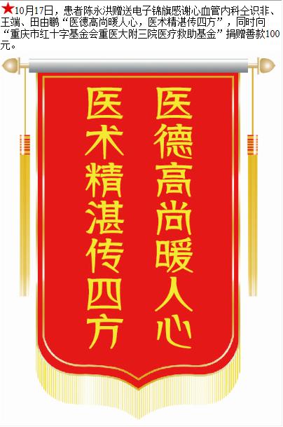 患者陈永洪赠送电子锦旗感谢心血管内科仝识非等人,并向医疗救助基金捐赠善款100元。-锦旗-患者心声-患者服务-重庆医科大学附属第三医院【官方网站】