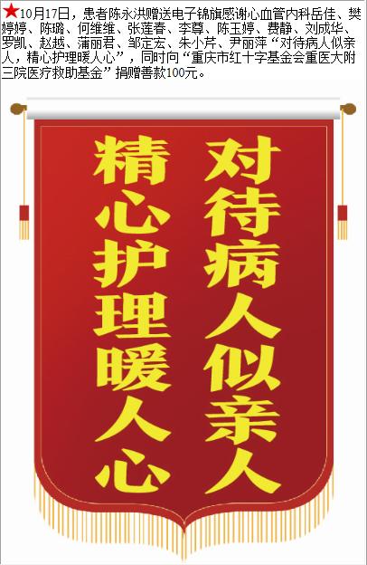 患者陈永洪赠送电子锦旗感谢心血管内科岳佳等人,并向医疗救助基金捐赠善款100元。-锦旗-患者心声-患者服务-重庆医科大学附属第三医院【官方网站】