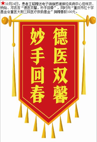 患者王韬赠送电子锦旗感谢神经疾病中心但林双等人,并向医疗救助基金捐赠善款100元。-锦旗-患者心声-患者服务-重庆医科大学附属第三医院【官方网站】