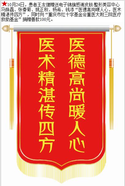 患者王友健赠送电子锦旗感谢皮肤/整形美容中心马姝磊等人,并向医疗救助基金捐赠善款100元。-锦旗-患者心声-患者服务-重庆医科大学附属第三医院【官方网站】