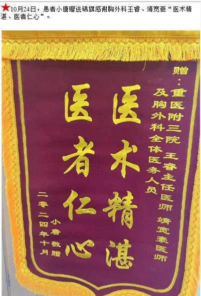 患者小唐赠送锦旗感谢胸外科王睿等人。-锦旗-患者心声-患者服务-重庆医科大学附属第三医院【官方网站】