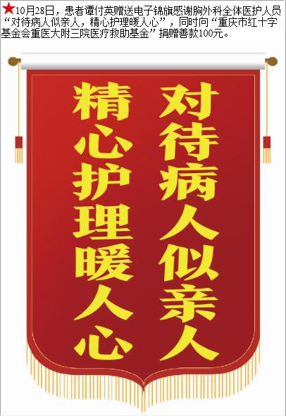 患者谭付英赠送电子锦旗感谢胸外科全体医护人员,并向医疗救助基金捐赠善款100元。-锦旗-患者心声-患者服务-重庆医科大学附属第三医院【官方网站】