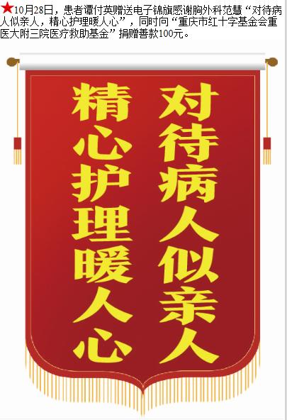患者谭付英赠送电子锦旗感谢胸外科范慧,并向医疗救助基金捐赠善款100元。-锦旗-患者心声-患者服务-重庆医科大学附属第三医院【官方网站】