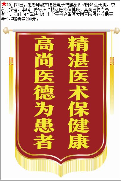 患者邱淑芹赠送电子锦旗感谢胸外科汪天虎等人,并向医疗救助基金捐赠善款200元。-锦旗-患者心声-患者服务-重庆医科大学附属第三医院【官方网站】