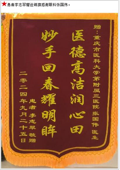 患者李志翠赠送锦旗感谢眼科张国伟。-锦旗-患者心声-患者服务-重庆医科大学附属第三医院【官方网站】