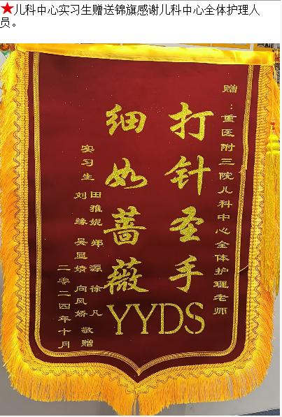 实习生赠送锦旗感谢儿科中心全体护理人员。-锦旗-患者心声-患者服务-重庆医科大学附属第三医院【官方网站】