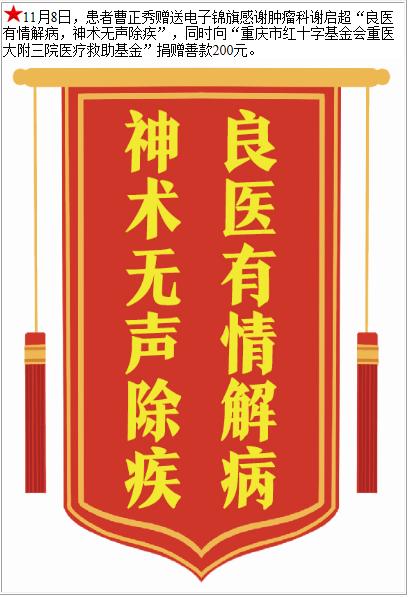 患者曹正秀赠送电子锦旗感谢肿瘤科谢启超,并向医疗救助基金捐赠善款200元。-锦旗-患者心声-患者服务-重庆医科大学附属第三医院【官方网站】