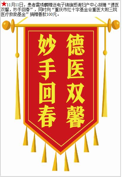 患者雷琇麟赠送电子锦旗感谢妇产中心胡珊,并向医疗救助基金捐赠善款100元。-锦旗-患者心声-患者服务-重庆医科大学附属第三医院【官方网站】
