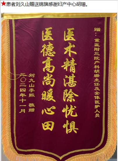患者刘久山赠送锦旗感谢妇产中心胡珊。-锦旗-患者心声-患者服务-重庆医科大学附属第三医院【官方网站】