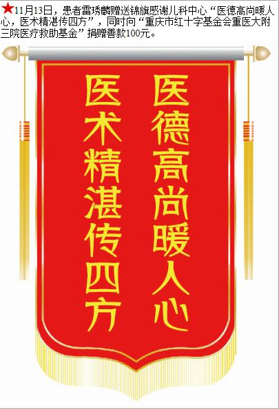 患者雷琇麟赠送锦旗感谢儿科中心全体医护人员。-锦旗-患者心声-患者服务-重庆医科大学附属第三医院【官方网站】