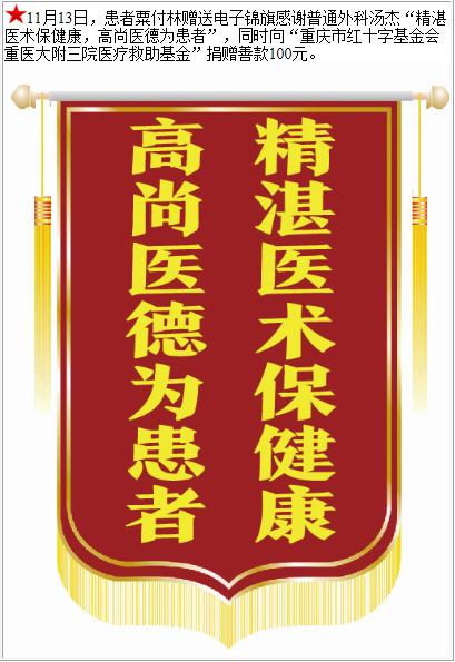 患者粟付林赠送电子锦旗感谢普通外科汤杰,并向医疗救助基金捐赠善款100元。-锦旗-患者心声-患者服务-重庆医科大学附属第三医院【官方网站】