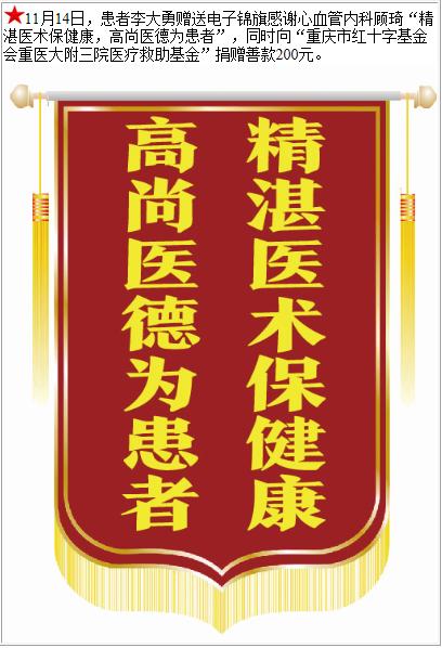 患者李大勇赠送电子锦旗感谢心血管内科顾琦,并向医疗救助基金捐赠善款200元。-锦旗-患者心声-患者服务-重庆医科大学附属第三医院【官方网站】