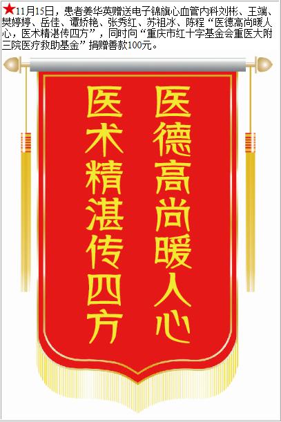 患者姜华英赠送电子锦旗心血管内科刘彬等人,并向 医疗救助基金捐赠善款100元。-锦旗-患者心声-患者服务-重庆医科大学附属第三医院【官方网站】