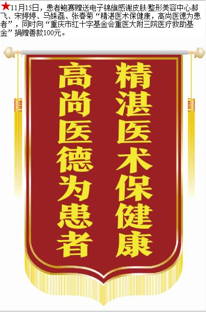 患者鲍赛赠送电子锦旗感谢皮肤/整形美容中心郝飞等人,并向医疗救助基金捐赠善款100元。-锦旗-患者心声-患者服务-重庆医科大学附属第三医院【官方网站】