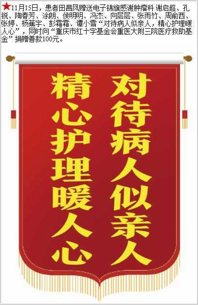 患者田昌凤赠送电子锦旗感谢肿瘤科 谢启超等人,并向医疗救助基金捐赠善款100元。-锦旗-患者心声-患者服务-重庆医科大学附属第三医院【官方网站】