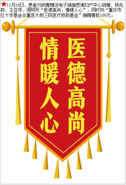 患者刘玥青赠送电子锦旗感谢妇产中心胡珊等人,并向医疗救助基金捐赠善款100元。-锦旗-患者心声-患者服务-重庆医科大学附属第三医院【官方网站】