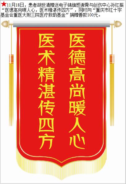 患者胡世清赠送电子锦旗感谢骨与创伤中心孙红振,并向医疗救助基金捐赠善款100元。-锦旗-患者心声-患者服务-重庆医科大学附属第三医院【官方网站】