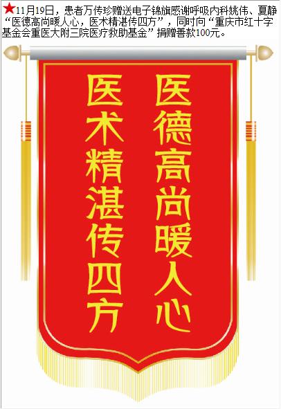 患者万传珍赠送电子锦旗感谢呼吸内科姚伟等人,并向医疗救助基金捐赠善款100元。-锦旗-患者心声-患者服务-重庆医科大学附属第三医院【官方网站】