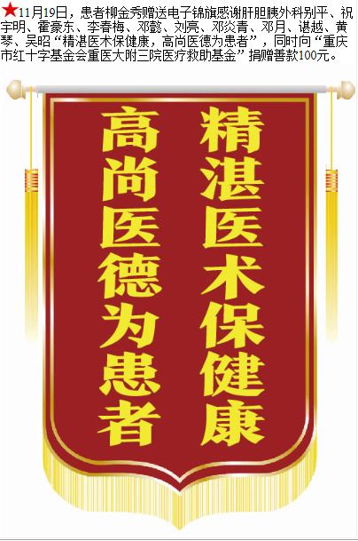 患者柳金秀赠送电子锦旗感谢肝胆胰外科别平等人,并向医疗救助基金捐赠善款100元。-锦旗-患者心声-患者服务-重庆医科大学附属第三医院【官方网站】