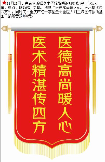 患者何昕赠送电子锦旗感谢神经疾病中心张云东等人,并向医疗救助基金捐赠善款100元。-锦旗-患者心声-患者服务-重庆医科大学附属第三医院【官方网站】