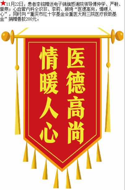 患者李铭赠送电子锦旗感谢院领导傅仲学等人,并向医疗救助基金捐赠善款200元。-锦旗-患者心声-患者服务-重庆医科大学附属第三医院【官方网站】