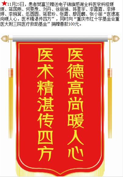 患者樊富兰赠送电子锦旗感谢全科医学科程媛媛等人,并向医疗救助基金捐赠善款100元。-锦旗-患者心声-患者服务-重庆医科大学附属第三医院【官方网站】