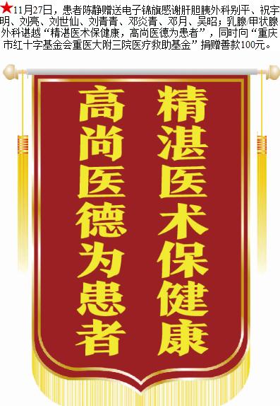 患者陈静赠送电子锦旗感谢肝胆胰外科别平等人,并向医疗救助基金捐赠善款100元。-锦旗-患者心声-患者服务-重庆医科大学附属第三医院【官方网站】