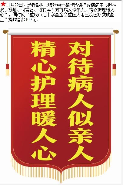 患者彭世飞赠送电子锦旗感谢神经疾病中心但林双等人,并向医疗救助基金捐赠善款100元。-锦旗-患者心声-患者服务-重庆医科大学附属第三医院【官方网站】