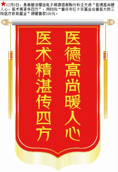 患者曾浩赠送电子锦旗感谢胸外科汪天虎,并向医疗救助基金捐赠善款100元。-锦旗-患者心声-患者服务-重庆医科大学附属第三医院【官方网站】