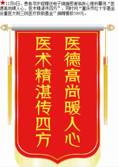 患者邓步程赠送电子锦旗感谢临床心理科瞿伟,并向医疗救助基金捐赠善款500元。-锦旗-患者心声-患者服务-重庆医科大学附属第三医院【官方网站】