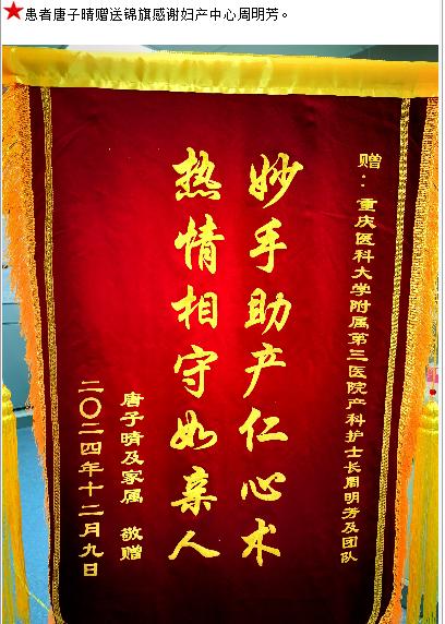 患者唐子晴赠送锦旗感谢妇产中心周明芳。-锦旗-患者心声-患者服务-重庆医科大学附属第三医院【官方网站】