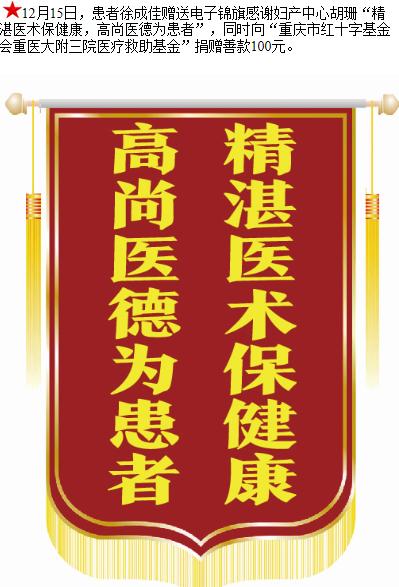 患者徐成佳赠送电子锦旗感谢妇产中心胡珊,并向医疗救助基金捐赠善款100元。-锦旗-患者心声-患者服务-重庆医科大学附属第三医院【官方网站】
