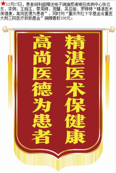 患者胡利超赠送电子锦旗感谢神经疾病中心张云东等人,并向医疗救助基金捐赠善款100元。-锦旗-患者心声-患者服务-重庆医科大学附属第三医院【官方网站】