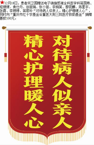 患者何卫国赠送电子锦旗感谢全科医学科蒋国燕等人,并向医疗救助基金捐赠善款100元。-锦旗-患者心声-患者服务-重庆医科大学附属第三医院【官方网站】