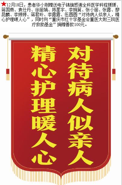 患者华小刚赠送电子锦旗感谢全科医学科程媛媛等人,并向医疗救助基金捐赠善款100元。-锦旗-患者心声-患者服务-重庆医科大学附属第三医院【官方网站】