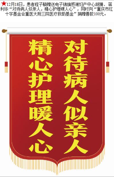 患者程子毓赠送电子锦旗感谢妇产中心胡珊等人,并向医疗救助基金捐赠善款100元。-锦旗-患者心声-患者服务-重庆医科大学附属第三医院【官方网站】