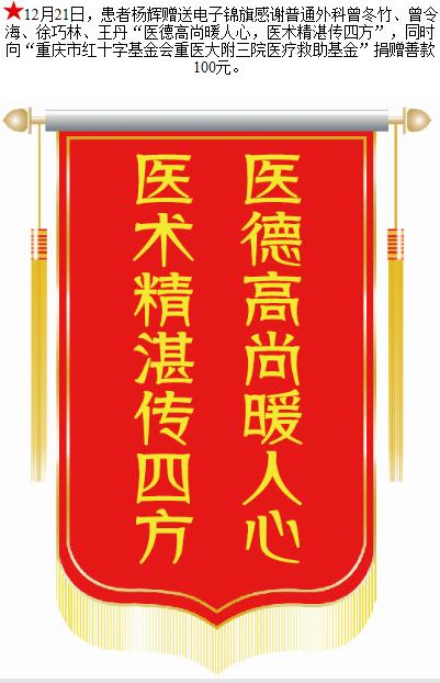 患者杨辉赠送电子锦旗感谢普通外科曾冬竹等人,并向医疗救助基金捐赠善款100元。-锦旗-患者心声-患者服务-重庆医科大学附属第三医院【官方网站】
