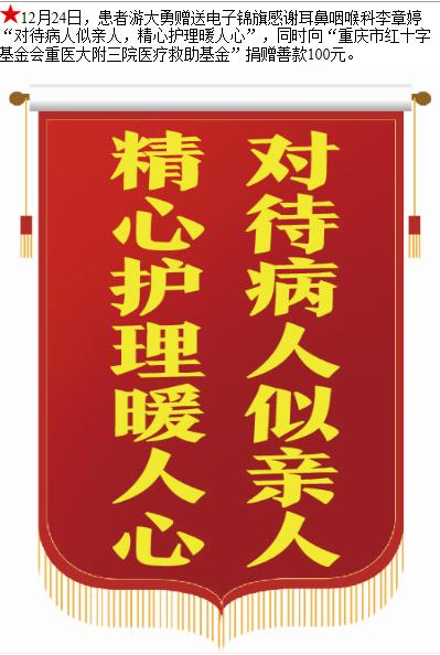 患者游大勇赠送电子锦旗感谢耳鼻咽喉科李章婷,并向医疗救助基金捐赠善款100元。-锦旗-患者心声-患者服务-重庆医科大学附属第三医院【官方网站】