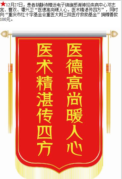 患者胡静诗赠送电子锦旗感谢神经疾病中心邓志宽等人,并向医疗救助基金捐赠善款100元。-锦旗-患者心声-患者服务-重庆医科大学附属第三医院【官方网站】